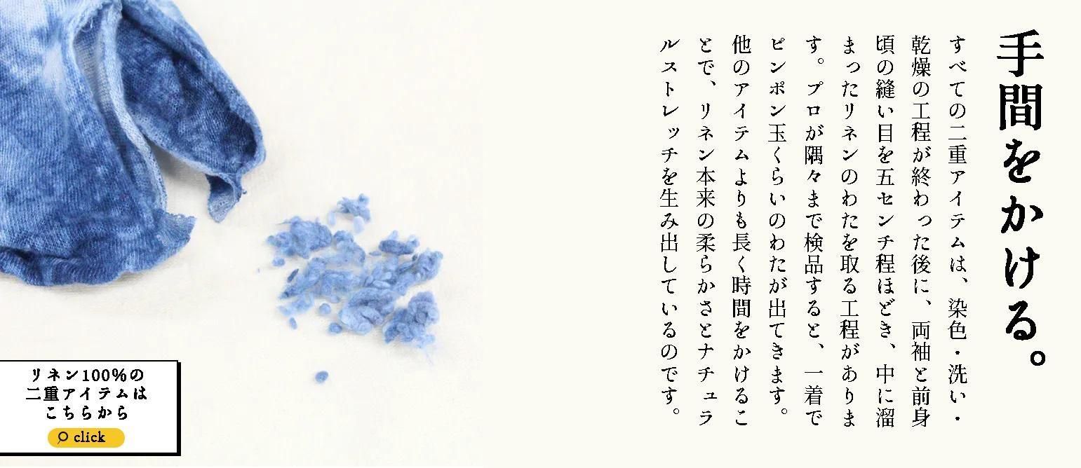 また、ネップと呼ばれる繊維が絡み合ってできた糸の節が生地表面に出ることが多くあります。節がある糸で編んでいくと、生地の表面にスジ状となったり丸いダマのように表れます。素材そのままの繊維(ワラのような表皮部分)が見られる場合もあります。ネップや繊維の出方には個体差がありますが、リネンの素朴な味としてお楽しみください。