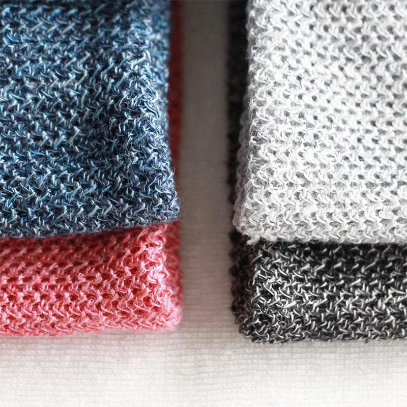 また、ネップと呼ばれる繊維が絡み合ってできた糸の節が生地表面に出ることが多くあります。節がある糸で編んでいくと、生地の表面にスジ状となったり丸いダマのように表れます。素材そのままの繊維(ワラのような表皮部分)が見られる場合もあります。ネップや繊維の出方には個体差がありますが、リネンの素朴な味としてお楽しみください。