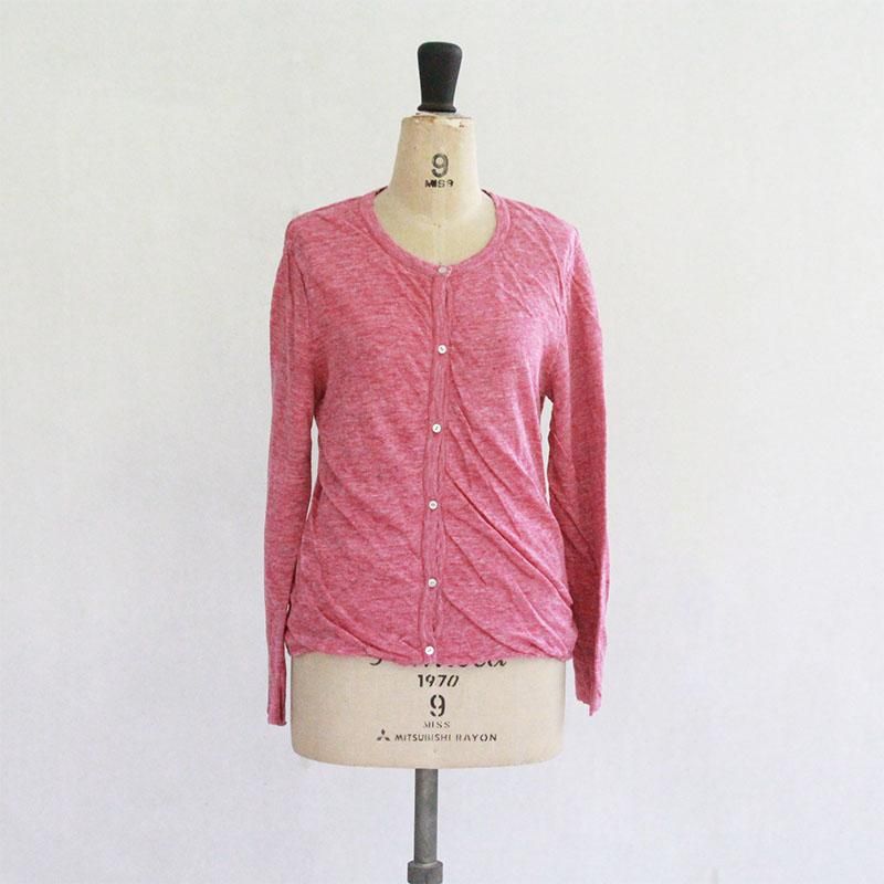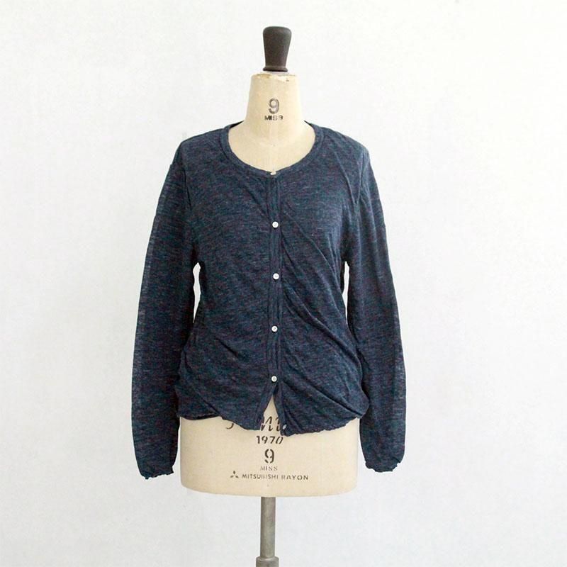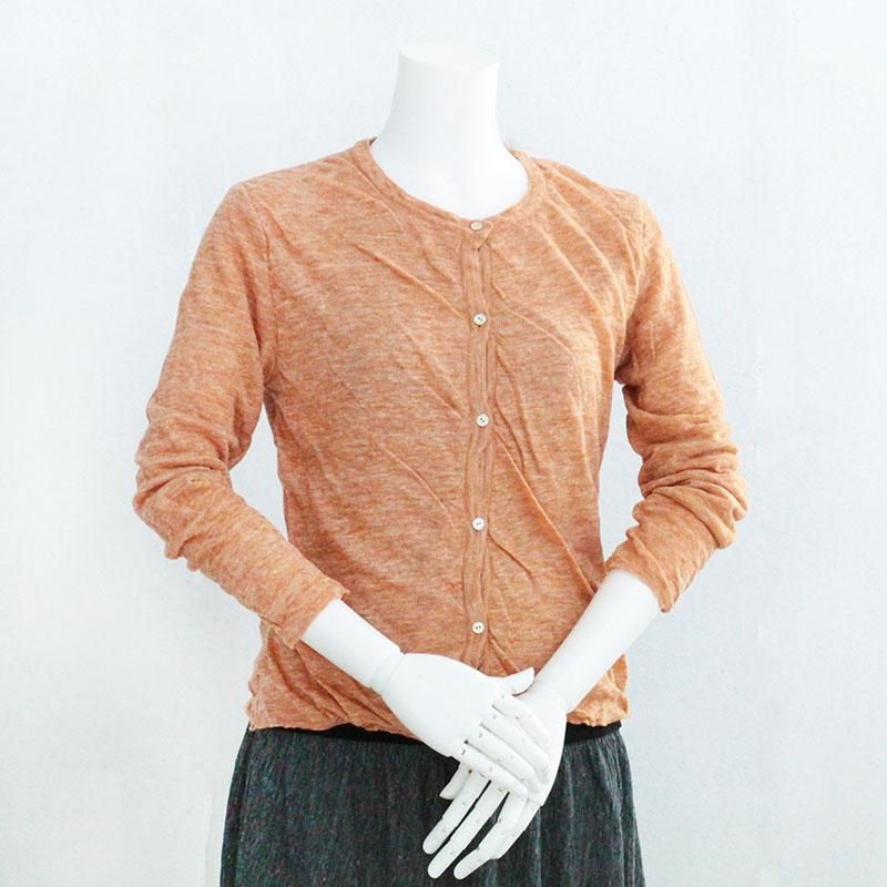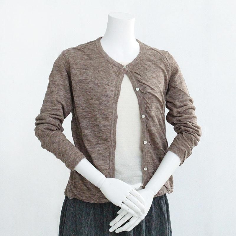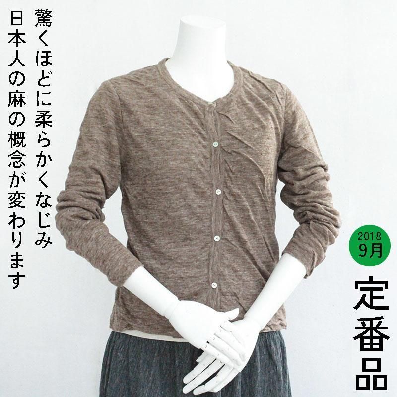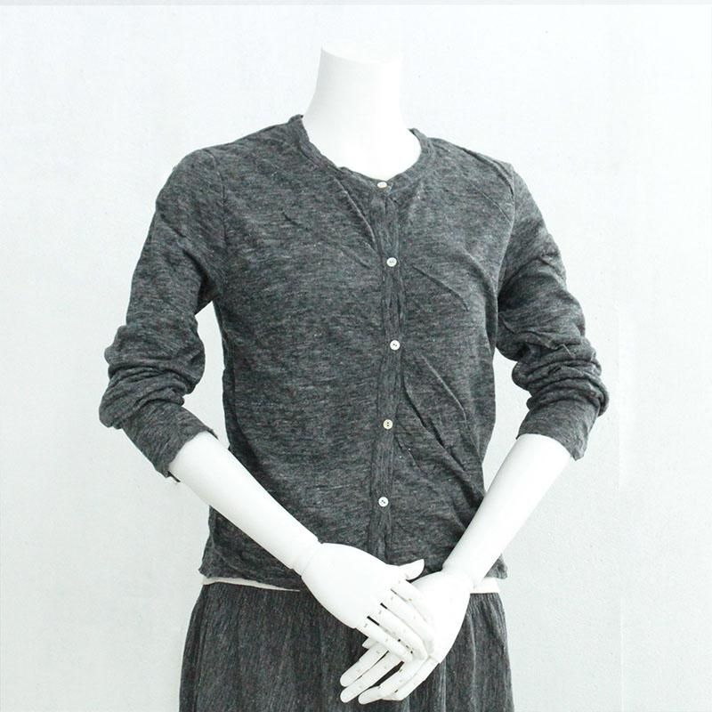 ・この編地は、リネン100%の素材と2重ニット構造で自然のストレッチ性を作りだしています。その為、他のアイテムに比べて寸法変化が大きい商品です。初めは小さめですが、着ていくとご自身の体に合わせてゆるみが出てきます。上記サイズは、着用・洗濯後の参考サイズとしていただくことをお勧めいたします。特に着丈や身巾が変化が大きいです。