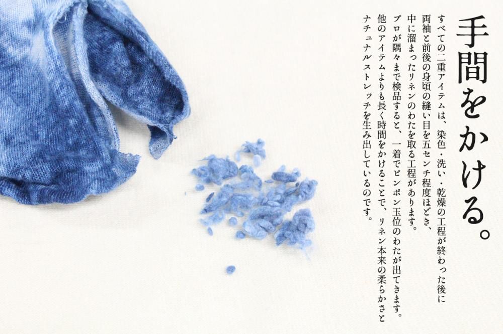 身頃のシワ・ヨレに見える部分は、糸の撚りを利用しています。オモテとウラで、撚りの方向を変えている為、着ていくうちに打ち消しあい、それぞれの体に合わせて馴染んで落ち着きます。